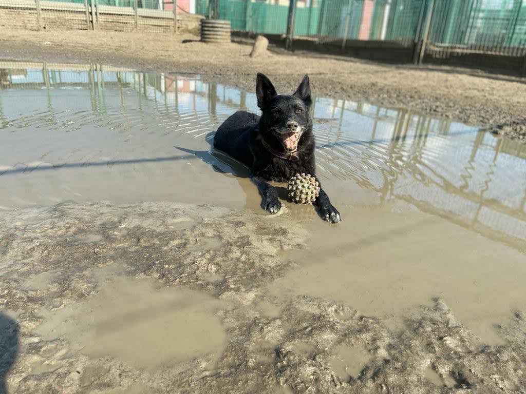 This wonderful black, eared guy got to the shelter in 2018. Grimm is a name that comes to mind at the sight of the large, handsome dog. Blue-black fur and such an interesting face - big ears and wide-set eyes give the impression of a formidable and serious animal. But one has only to look him in the eyes, Grimm immediately turns into Gavrusha - nice guy, with an ingratiating look, seeking human attention. Gavru is handsome, not averse to compete with the boys in the paddock, so he walks with calm dogs. His real passion is balls! And they should be necessarily squeaky. It is not possible to watch without a smile, like this handsome, outwardly, serious dog runs around the paddock with a beloved toy or digging a trench that would hide his "treasure." So, the soul of the sweetest puppy lives in that large, redoubtable body.
