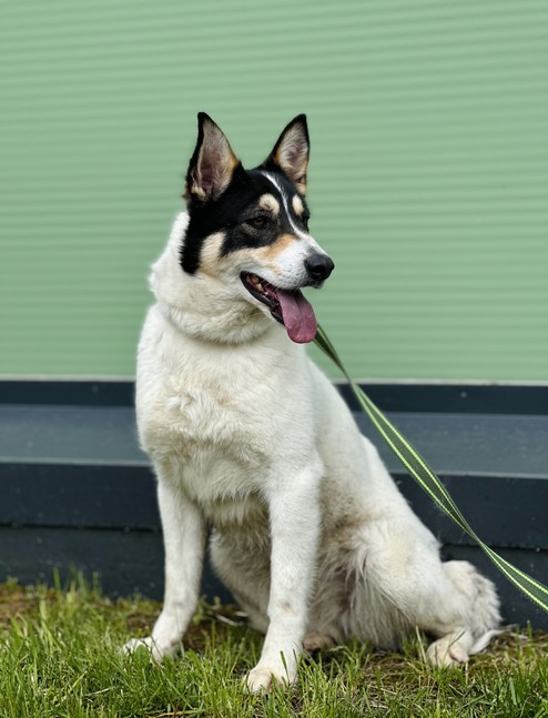 Афина очень красивая - у нее довольно редкий окрас, абсолютно белоснежная шерстка, при этом яркая трехцветная мордочка, роскошные крупные ушки, светлые бровки, придающие ей трогательный вид и глаза цвета гречишного меда.